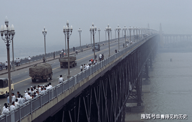 1985年,南京长江大桥在夕阳的映照下显得格外壮观。这座大桥自1968年建成以来,车流量并不算多,因此桥面显得十分宽敞,行人悠闲地穿行其上,自行车和摩托车在桥上缓缓驶过,形成了一幅宁静的画面。在桥上,几位农民伯伯正艰难地推着装满鹅的自行车,脸颊上渗出的汗水显示出他们的辛劳与坚持,整个场景透着一种简单而真实的生活气息。