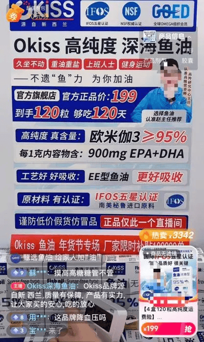 “Okiss深海鱼油”直播间里,主播正在热情推荐,一款所谓“源自新西兰”的深海鱼油产品。