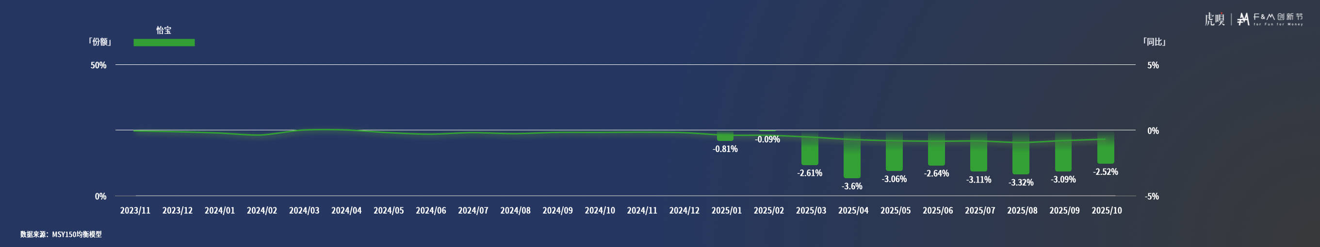 图中绿色线是怡宝的市场份额,绿色柱则是怡宝的市场份额同比变动。详细看怡宝的市场份额走势与同比变动情况,去年的表现非常稳定,上市时大家都感叹怡宝品牌力太强,能守住2元纯净水的“护城河”。但今年,怡宝每个月的市场份额都比去年下跌2-3个点,下滑非常惊人,这直接对怡宝造成了很大冲击。